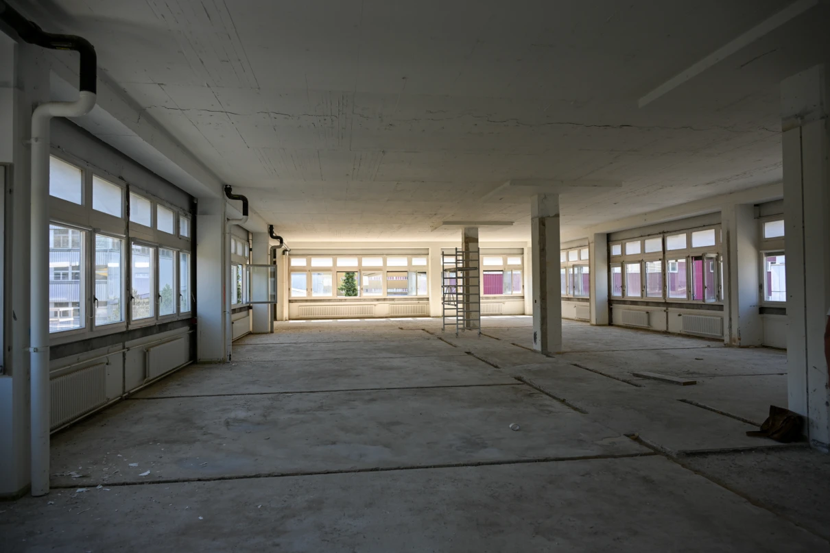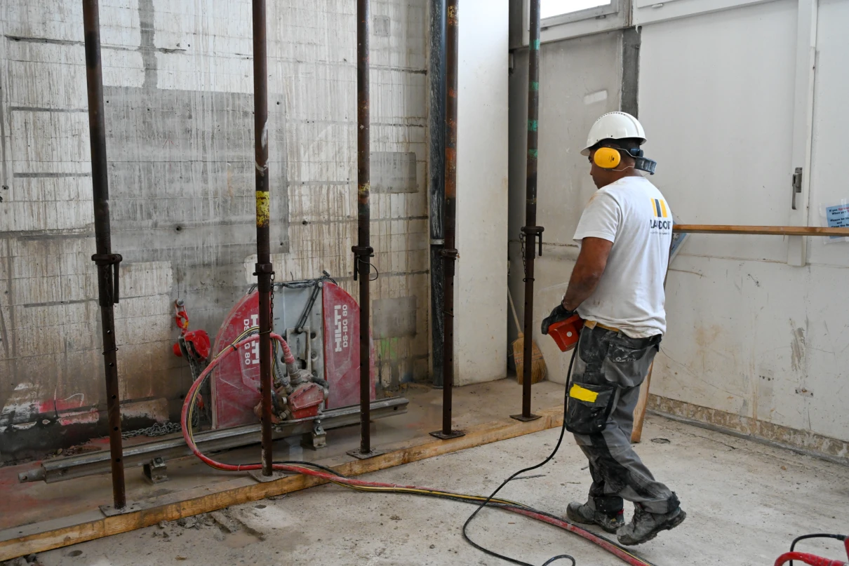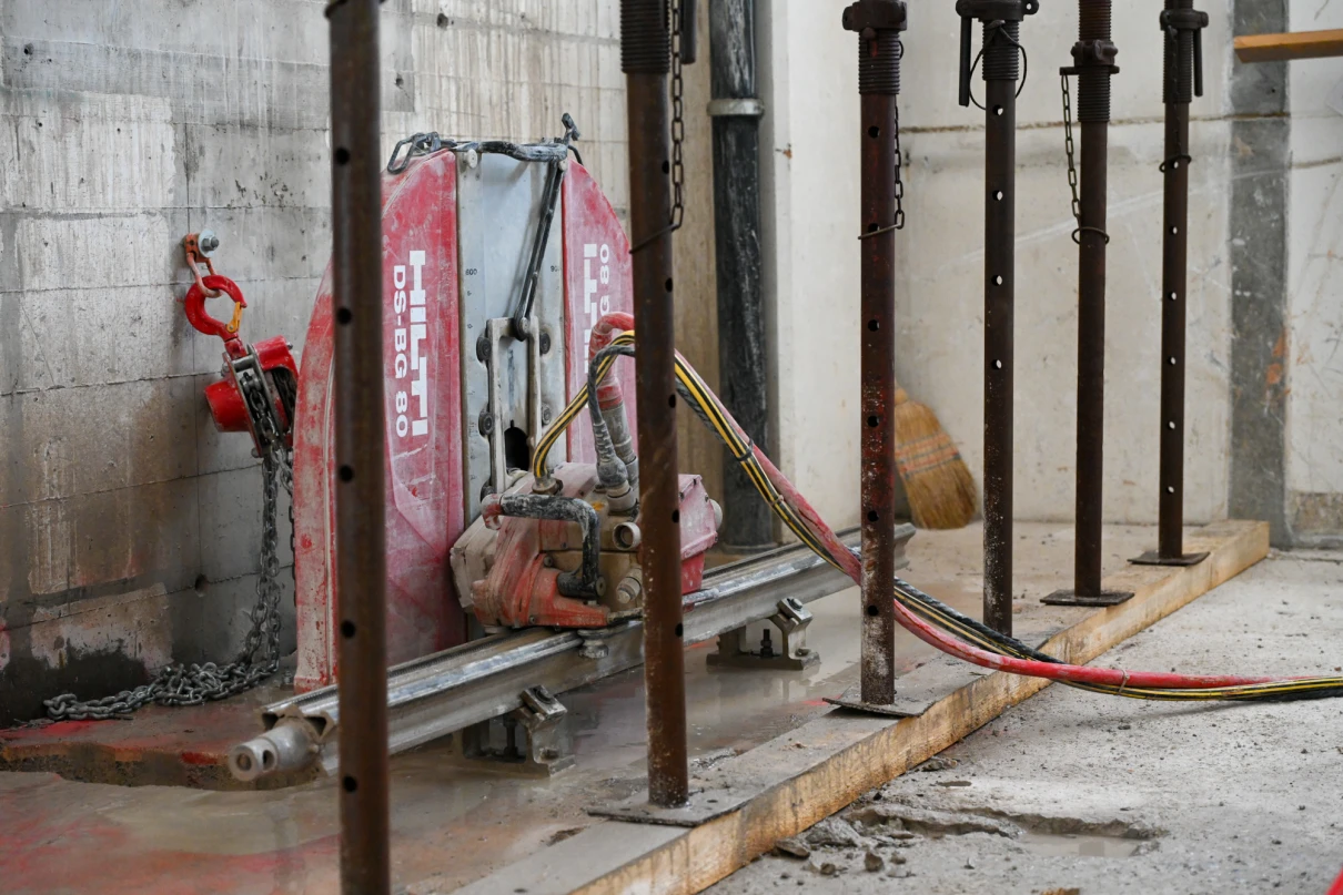 Unser Leistungsumfang umfasst das Erstellen von Bodenschlitzen in der bis zu 60 cm starken Bodenplatte mittels Hochdruckwasserstrahltechnik (HDW), diverse Maurerarbeiten sowie statische Verstärkungen durch den Einbau vorfabrizierter Beton- und Stahlstützen. Zusätzlich führen wir die Ortbetonarbeiten für die neuen Liftschächte aus.